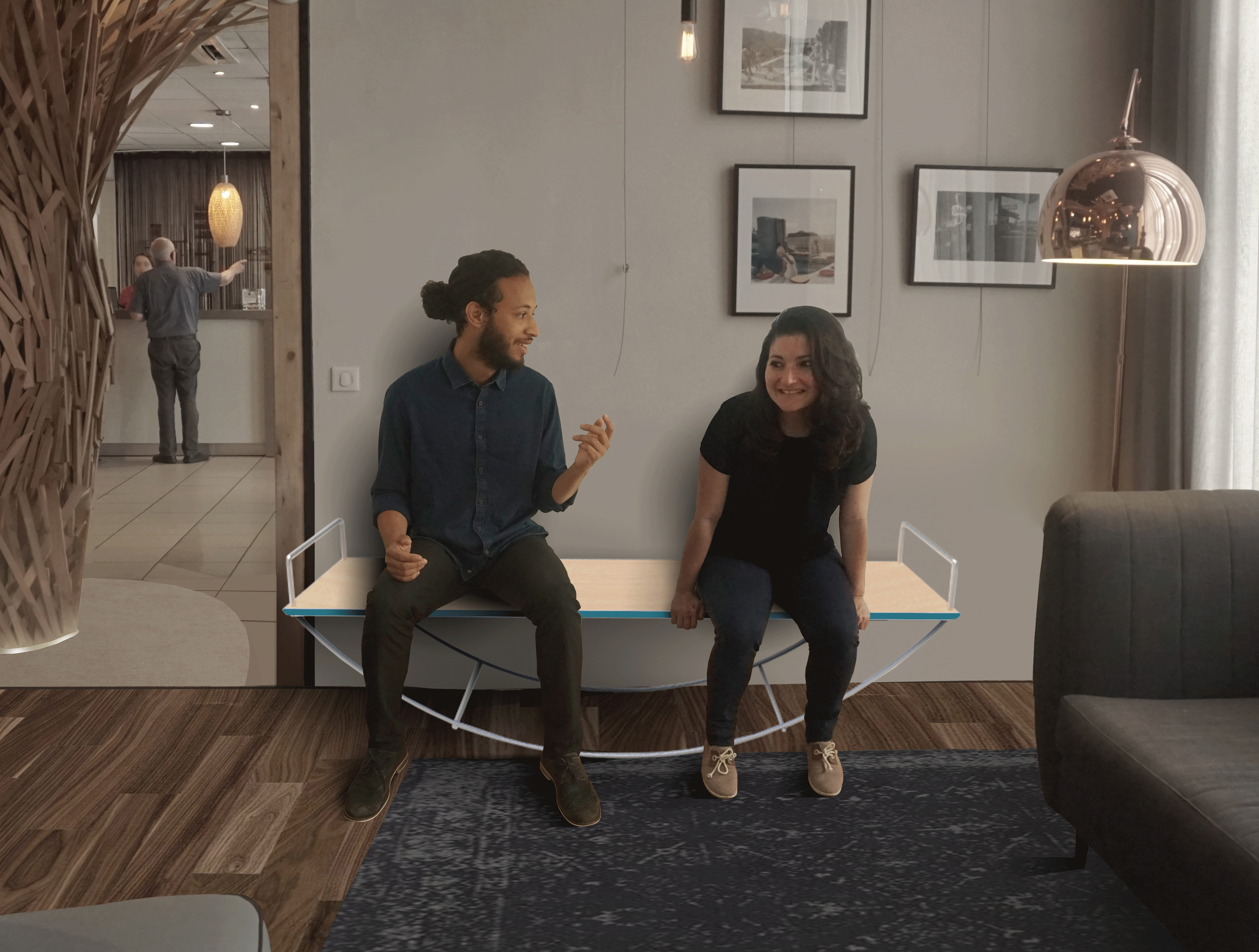 Perluette is a rocking bench, it creates emotions. This project is finalist of the « Design moi un objet » 2018 competition carried by the Ibis Style brand. In order to keep this bench level, cooperation is needed! Each of our movements has an effect on the balance. Perluette creates both physical and social interactions.