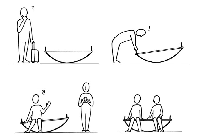 Avec ses lignes épurées et ses allures d’équilibriste, Perluette est un banc qui fait appel à la coordination de groupe. Ce n’est pas le moment de rester le nez rivé sur son portable. Il faut se déplacer à gauche, à droite, et accorder mouvements avec les personnes assises avec nous. Perluette amène naturellement rencontre et discussions.